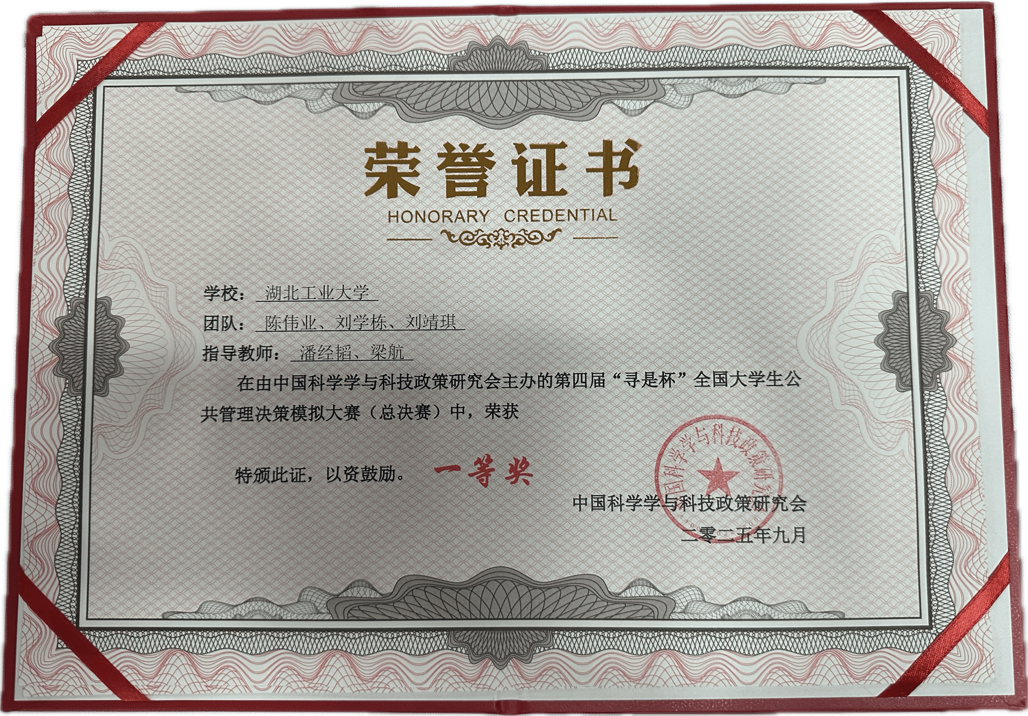 经管学院历来高度重视学科竞赛工作,自本次赛事启动以来,为参赛队伍提供全方位的支持与保障。近年来,公共管理系以行政管理国家级一流本科专业建设为契机,不断深化专业实践改革,已连续四届组织学生参与“寻是杯”全国大学生公共管理决策模拟大赛。在将近8个月的前期准备阶段,赛事指导团队通过10余轮模拟对抗遴选参赛队员,并邀请往届获奖团队进行多次赛前指导。在今年5月举办的华中赛区比赛中,我院学子以优异表现荣获一等奖,从55支华中赛区队伍中脱颖而出成功晋级全国总决赛。本次总决赛竞争激烈,共有来自全国七大赛区的100支高校队伍参与角逐,其中不乏北京大学、中国人民大学、南京大学、武汉大学、西安交通大学、北京师范大学等知名学府。在全国总决赛比赛阶段,我院参赛队伍在案例设计、5期沙盘推演与决策对抗环节中通力合作、配合默契、表现优异,最终荣获一等奖。