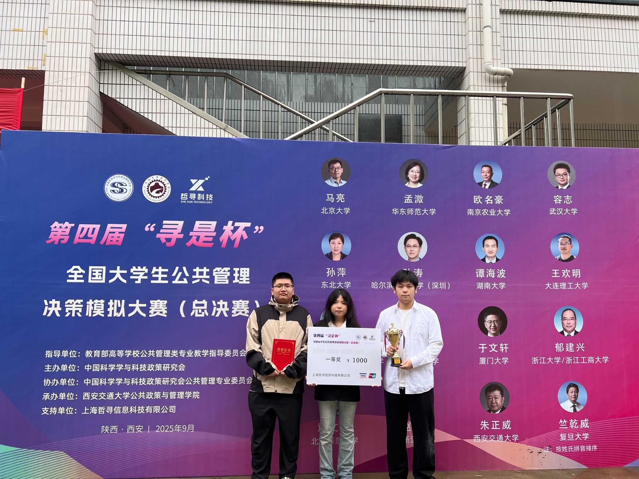 2025年9月20日-21日,第四届“寻是杯”全国大学生公共管理决策模拟大赛(总决赛)在西安交通大学顺利举办。在中心潘经韬副教授和梁航博士两位老师的指导下,2022级行政管理专业学生陈伟业、刘学栋和刘靖琪代表我校参赛,并斩获全国总决赛一等奖。