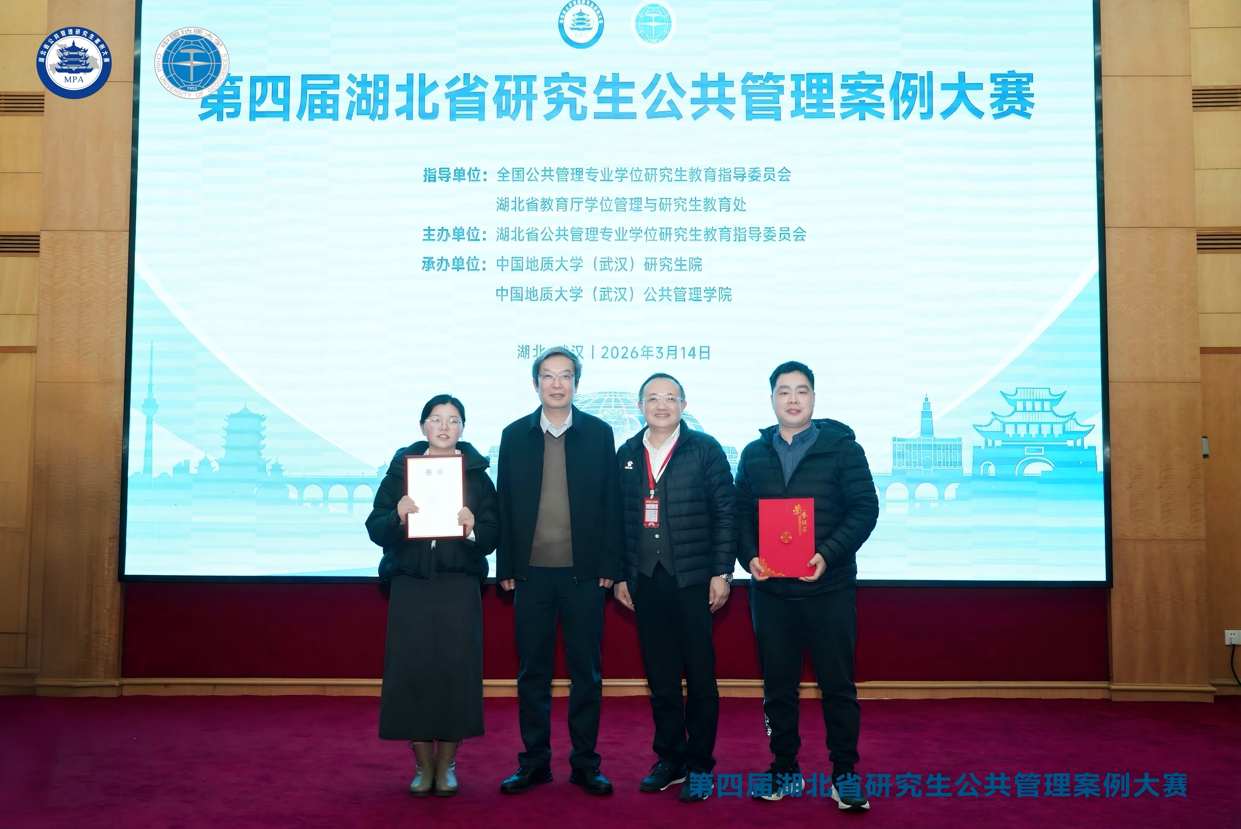 3月14日,第四届湖北省研究生公共管理案例大赛在中国地质大学(武汉)顺利举办。本次大赛由全国公共管理专业学位研究生教育指导委员会、湖北省教育厅学位管理与研究生教育处指导,湖北省公共管理专业学位研究生教育指导委员会主办,中国地质大学(武汉)公共管理学院承办。湖北省MPA教指委委员、湖北农村社会管理创新研究中心主任孙浩教授受邀出席总决赛并担任专家评委。